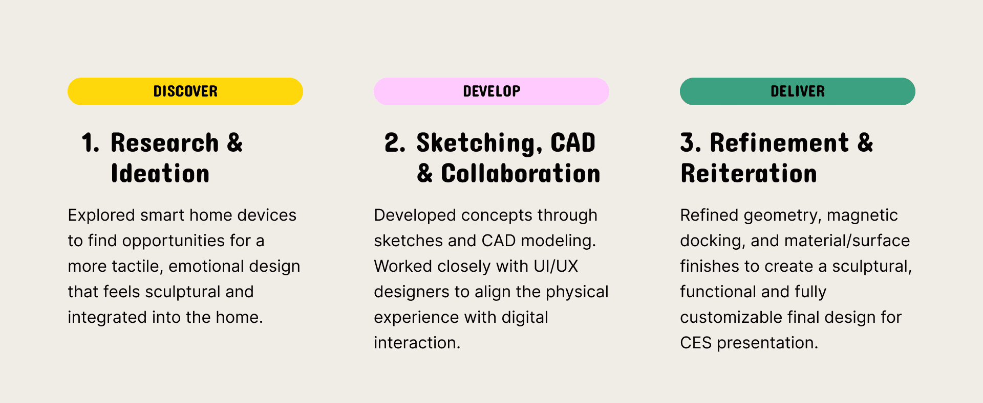 Seeing a gap for softer, more tactile smart tech, I explored form and ergonomics through sketching and modeling, collaborated with UI/UX to match interactions to the design, and refined materials and CAD form in SolidWorks and KeyShot.